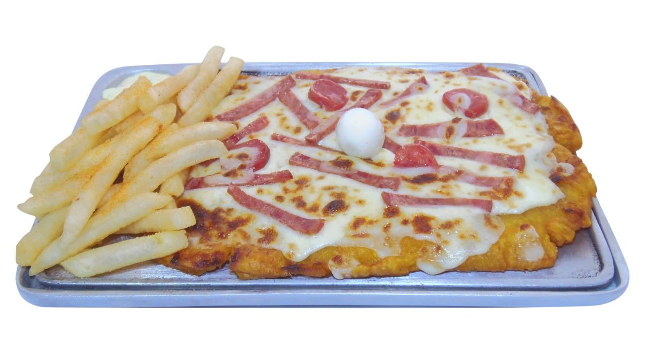 Con queso gratinado, papa a la francesa y huevo de codorniz.