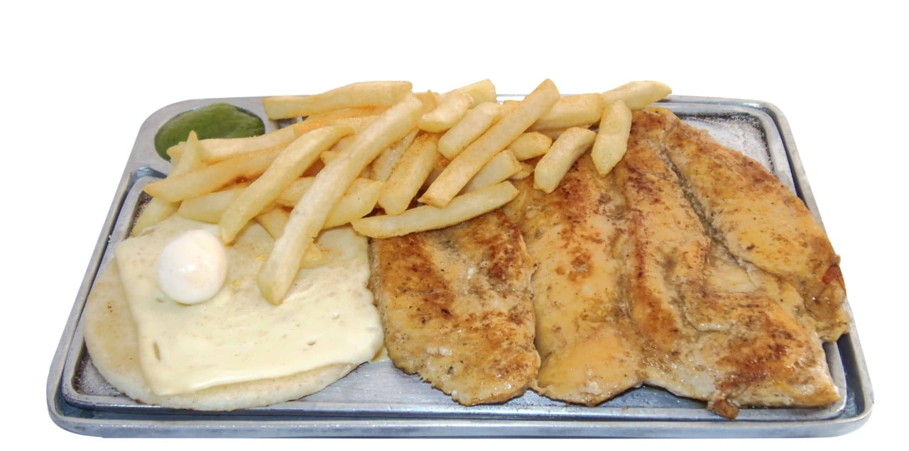 Pechuga de pollo acompañado con ensalada, papa a la francesa, huevo de codorniz y arepa gratinada.